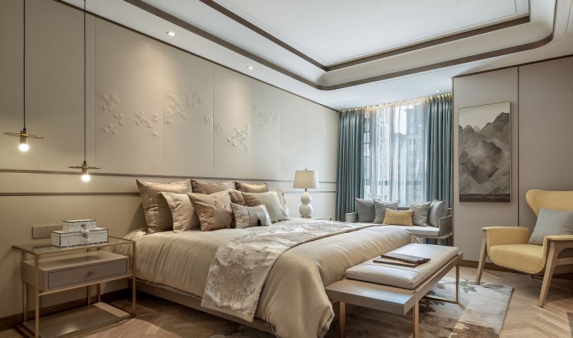 皮革床頭背景,搭配古銅線條,簡單的山水裝飾,淺咖色營造空間氛圍,一派中式意趣。