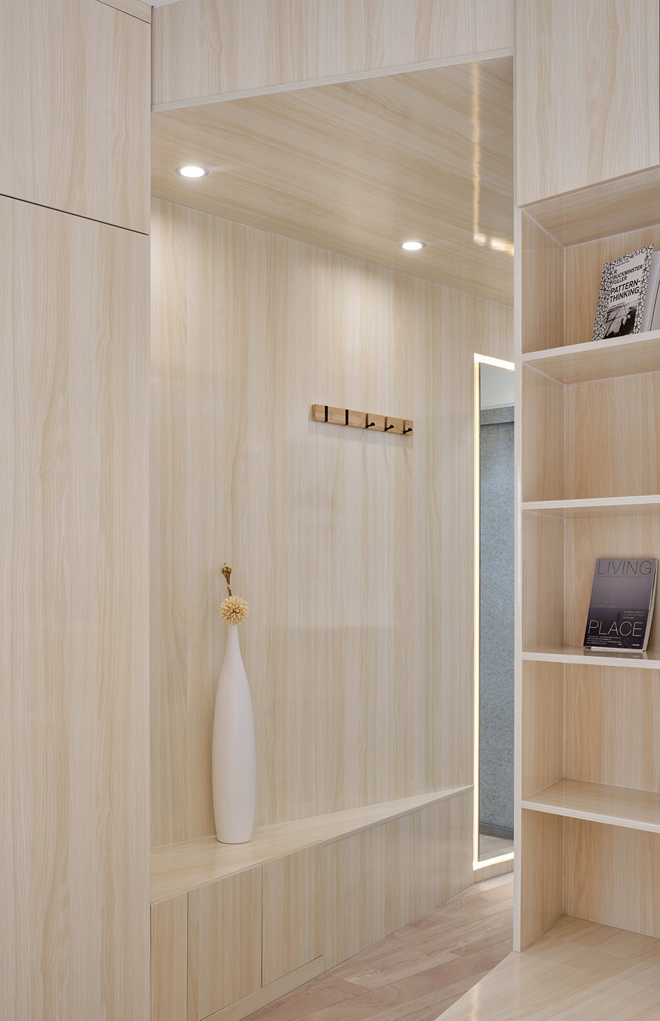實際得房面積僅為34平米。因此針對業主本身訴求和情況,需要設計師具有針對性的“量身定制”。業主為一名單身女性,從事教師職業,平時喜好看書閱讀且社交需求較少。同時由于房間面積較小,方案也需要具備較多儲物空間。在了解業主信息背景和功能需求后,設計師決定以木制家居風為主,打造一個簡約、溫馨且集整理容納多功能一體的袖珍“民宿”。