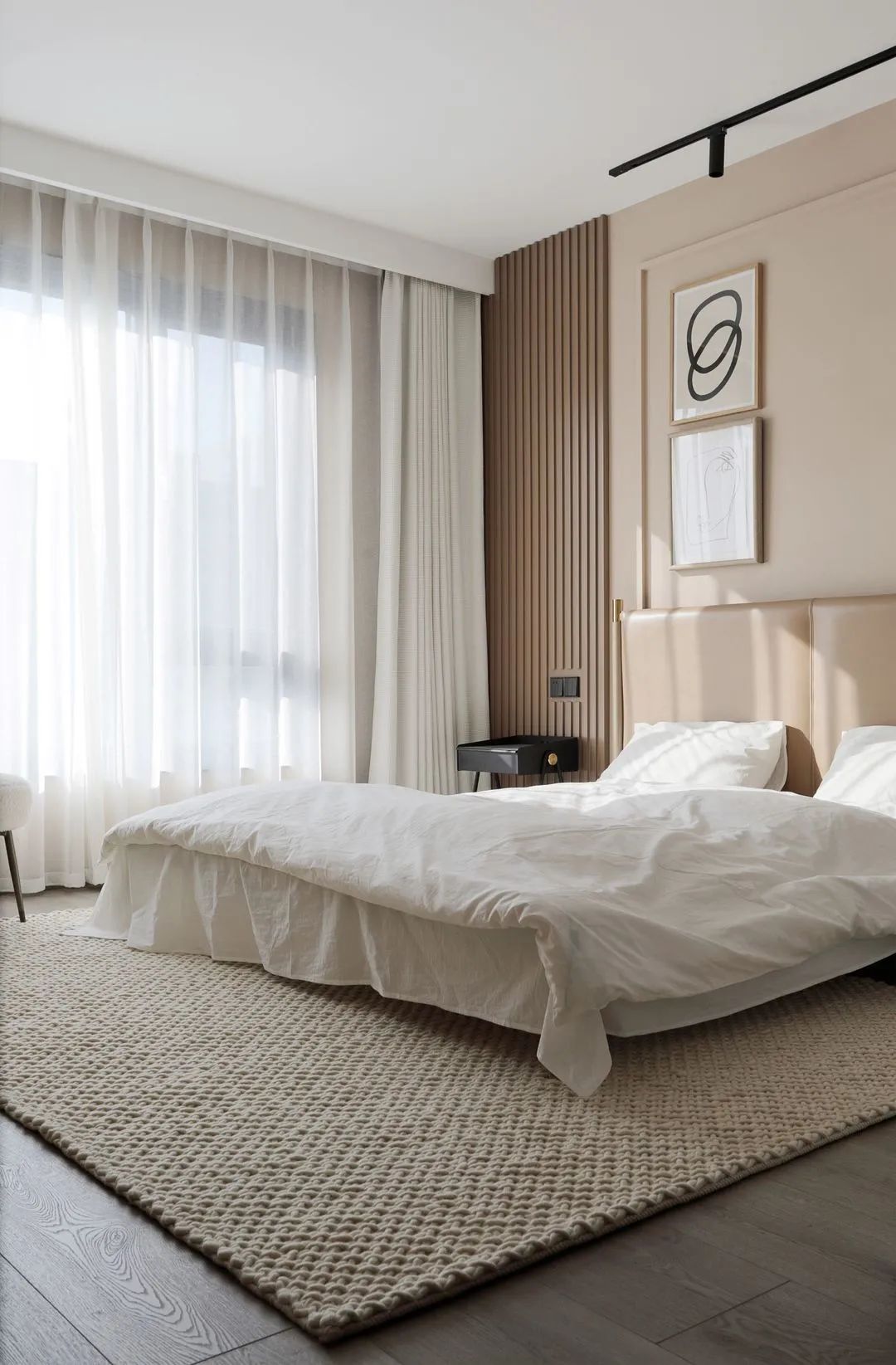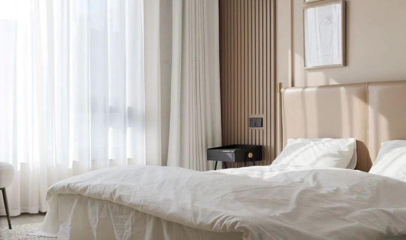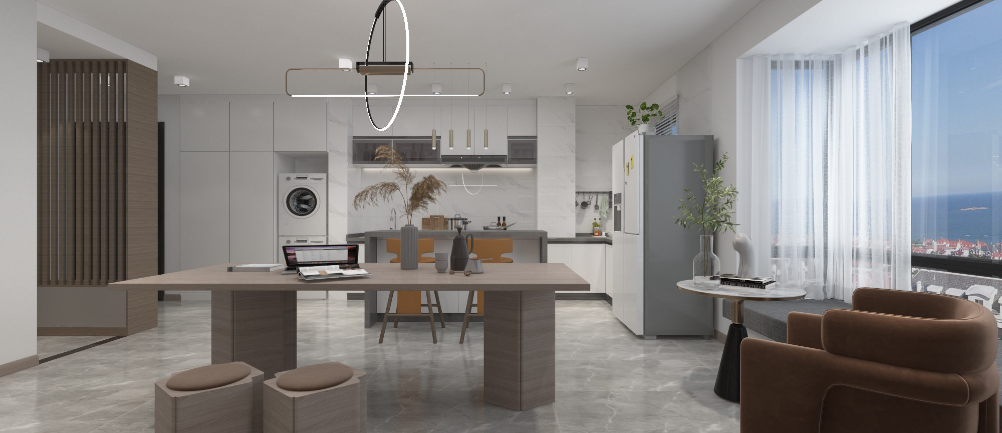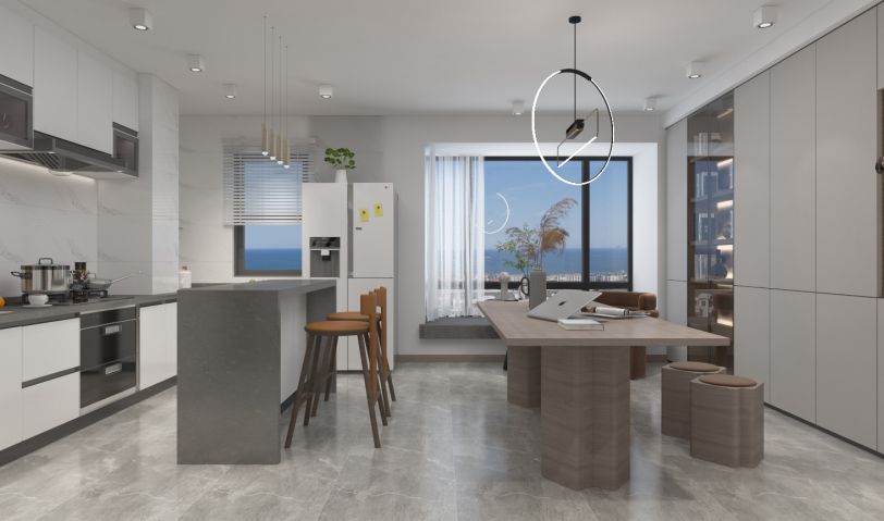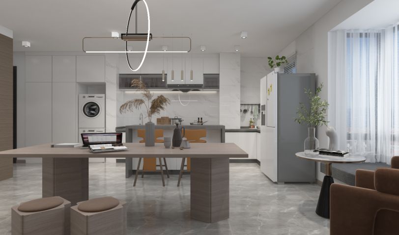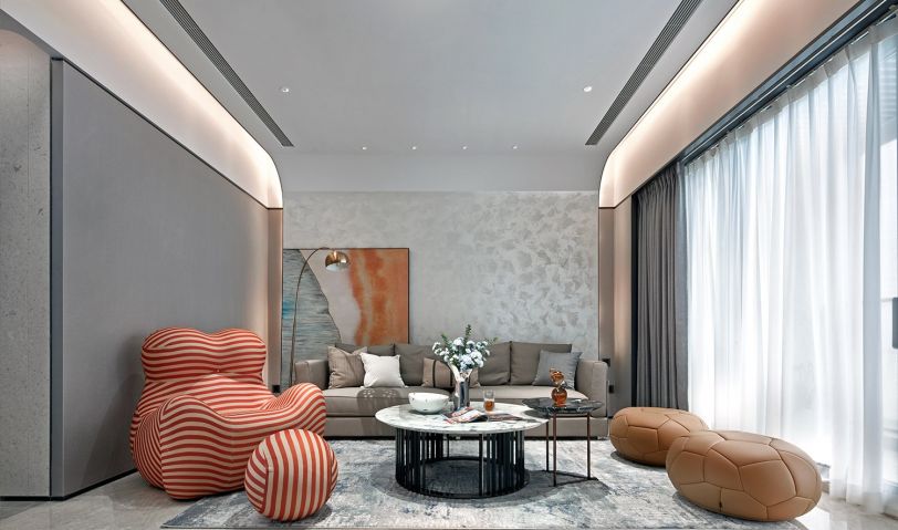 年輕夫妻居住,比較追求設計感和舒適度。摒棄了常規沙發客廳的效果,放了大桌子的效果,男女主人可以在長桌上辦公,也可以陪孩子一起做手工,增添了親子間的樂趣。