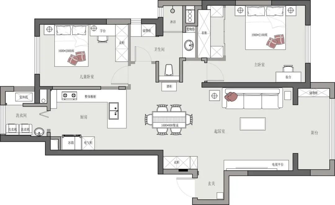 水泥灰由會客區向用餐區蔓延開來,奠定了公共空間的整體基調。臥室門調整后,墻面得到了有效利用,餐椅和長凳的組合,比傳統餐桌椅組合更加靈動活潑,也更具實用性。