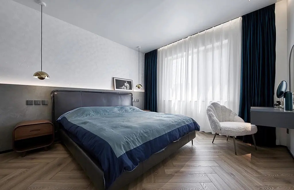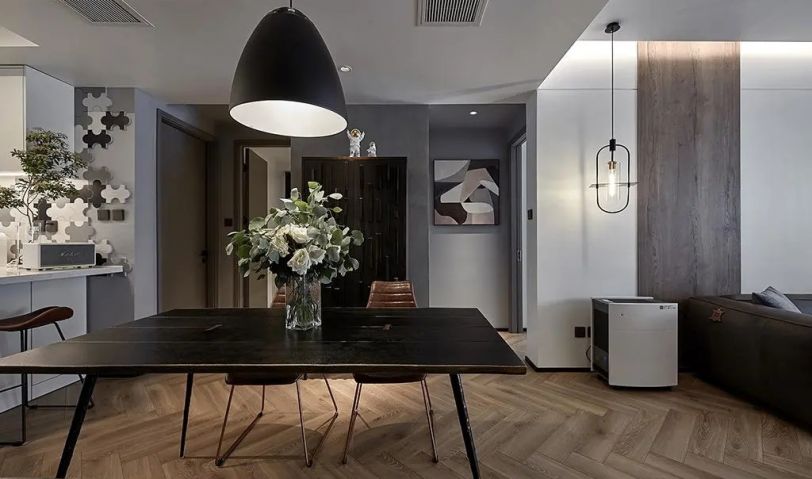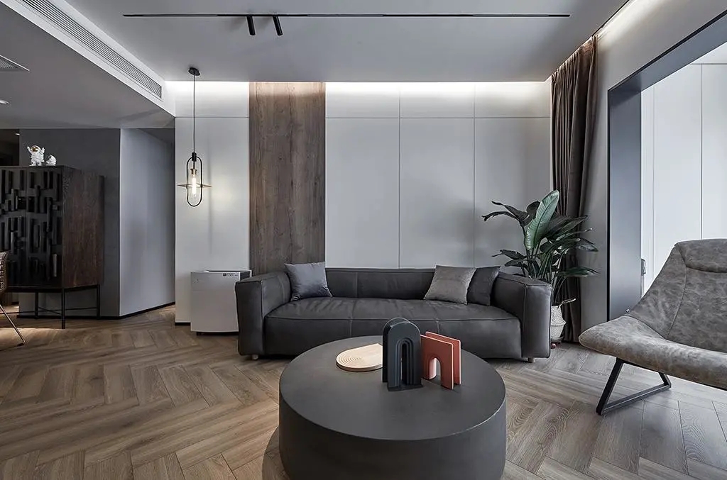 客廳整體采用極簡復古風格,人字拼的復合地板給家具和裝飾品提供了一個有層次感的背景。水泥灰墻面、巖灰色沙發、水泥色茶幾點綴上一圈金色,硬朗與柔美共存,沉淀出厚重的氣息。在喧囂都市里,讓家里的顏色沉靜下來,也給內心騰出一片清靜凈土,休整后迎接新一天的整裝待發。