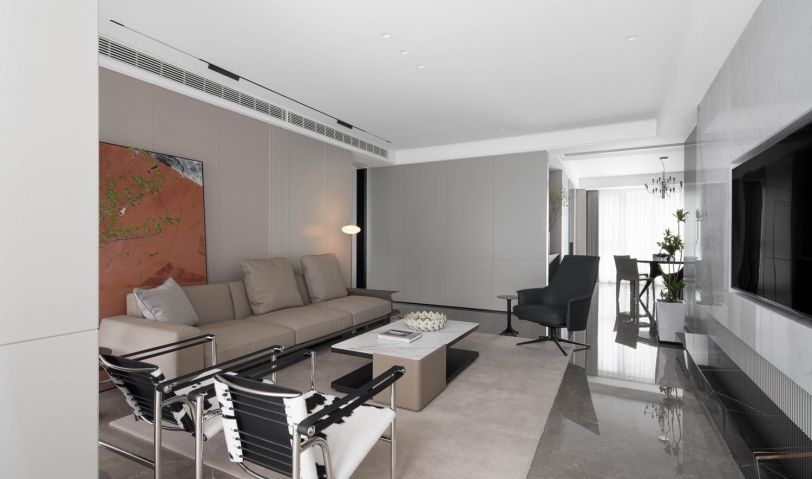 大面積的暖灰色奠定了簡約的視覺基調,豎紋墻飾、柔軟布藝默契的形成一種舒適的氛圍。寬大的落地窗為主臥提供了充足的采光和開闊的視野,坐在軟臥沙發里讀一本最愛的書,享受生活中那些不經意的幸福時光。