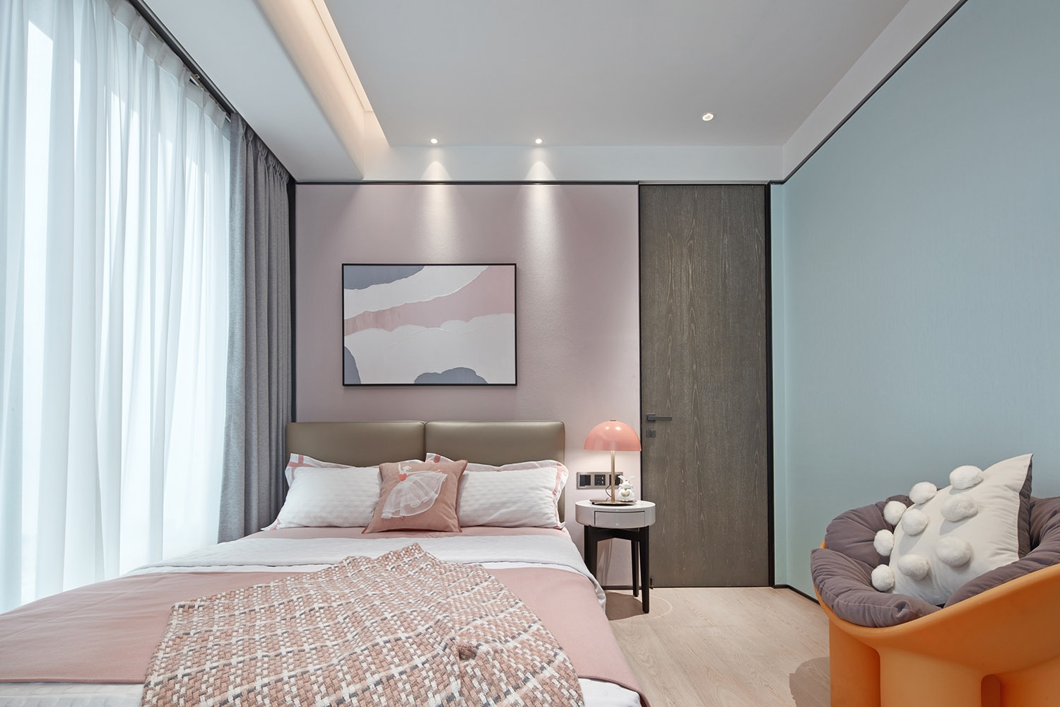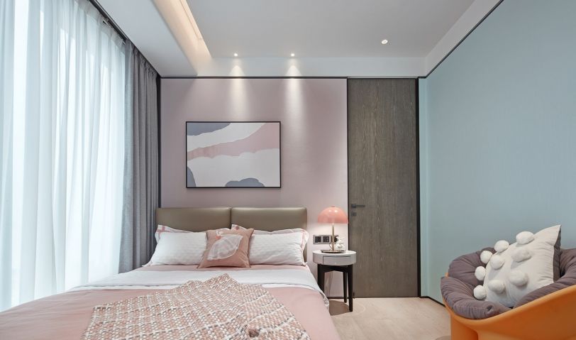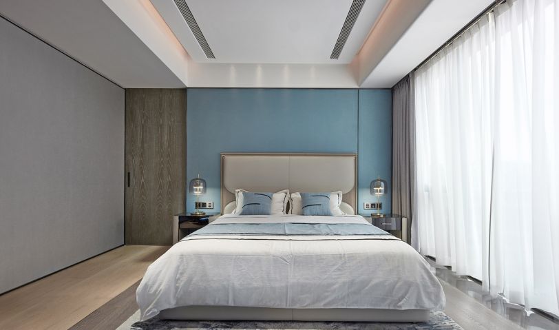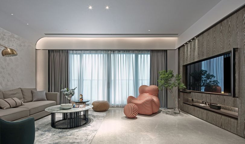 客廳的天花板至背景墻,整體一氣呵成,沒有邊界感,讓生活更加的自在。圓弧的造型搭配側邊的墻布,輕柔觸感,讓空間增加軟的感覺。光線搭配十分柔和,背出光的燈帶,有延伸的層次感,在感官上非常的舒適;自然光透過薄紗窗簾,空間透亮而清澈,仿若置身于被陽光直射的水中。