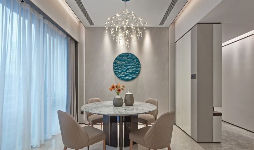 這世間,唯有美食與愛不可辜負。客餐廳天花采用多層次的燈光,主燈采用BAXTER 的吊燈,搭配輕奢質感的墻布,這樣就是一個舒適愉悅的就餐空間了。人與人之間只要有一個焦點,就能讓我們匯集在一起,去探討美好的人生。質感的島臺和藍色的靠背,就好像海面的小島一樣,在這里喝酒暢聊,有一種自由暢然之感。