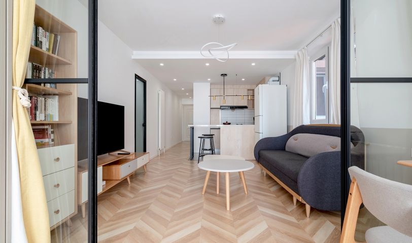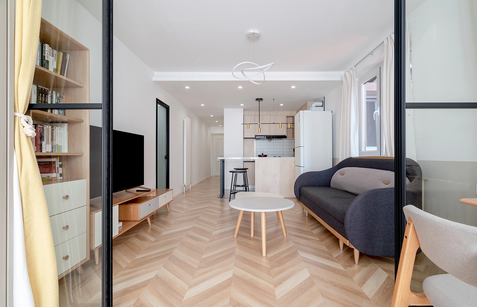 客廳選購可折疊的雙人布藝沙發(fā)床,臨時還能充當(dāng)?shù)木幼】臻g。魚骨拼地板,給空間的帶來層次感,還有一種釋放延伸的效果。電視背景墻區(qū)域沒有做過多的裝飾,簡單的電視柜以及書柜組合,增加家居的靈活性,也方便后期挪動。