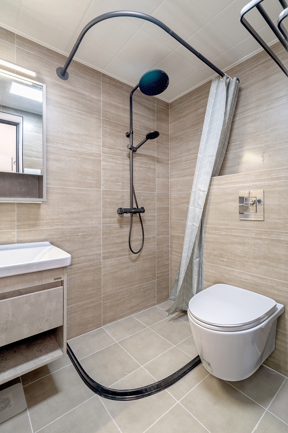 淋浴空間采用浴簾做遮擋的形式,讓使用方便,空間更加的靈活。壁掛馬桶懸空,方便地面的清潔工作。黑色的浴具,使衛(wèi)生間凸顯現(xiàn)代感。
