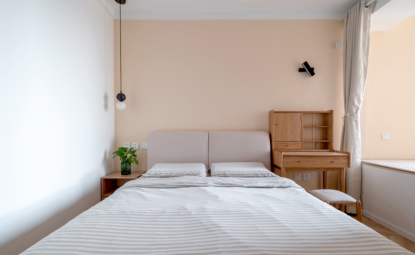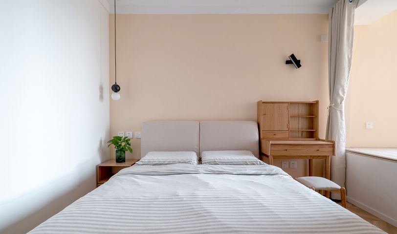 臥空間把原本屬于廚房的一小塊陽臺,納入囊中,規(guī)劃進(jìn)來成了地臺,具備儲物也具備休閑功能。在地臺與床體之間,安排了絕對不可舍棄的梳妝臺。簡約的壁燈,既可以滿足美妝照明需求,還能充當(dāng)夜讀燈使用。素色的床品與肉粉色的墻面,相輔相成,整體干凈明了