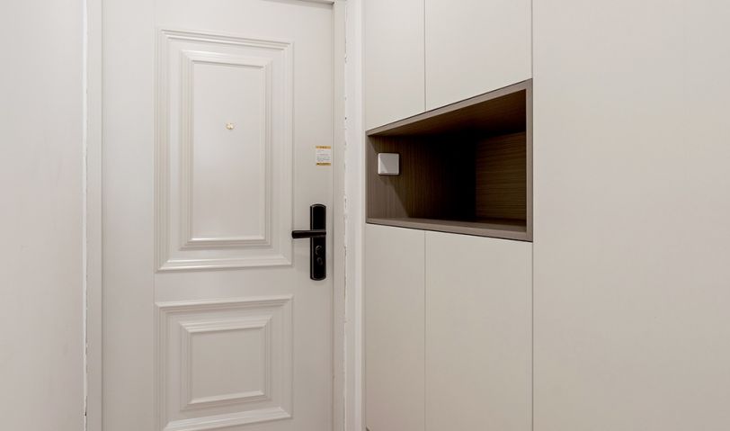 玄關(guān)經(jīng)過格局改造后,大大增加了鞋柜的儲存量,讓一組柜子,就可以滿足全家人的鞋子儲藏。鞋柜的最下方做懸空,方便屋主進(jìn)門后,更換居家拖鞋,中下部分做當(dāng)季鞋子的儲存,中部做了木色套格做為包以及鑰匙的擺放區(qū),上部區(qū)域做換季鞋子的儲藏區(qū)域。