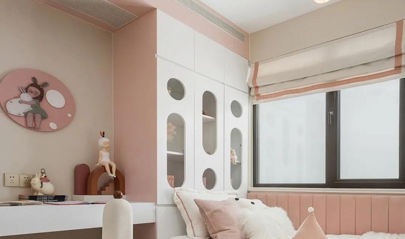 設計師賦予此間的是女孩溫柔可愛的性格,圓形幾何語素的地毯和燈具、生動活潑的擺件與掛畫,在淺粉與白色的色調烘托下,氤氳出女孩的浪漫與純真。