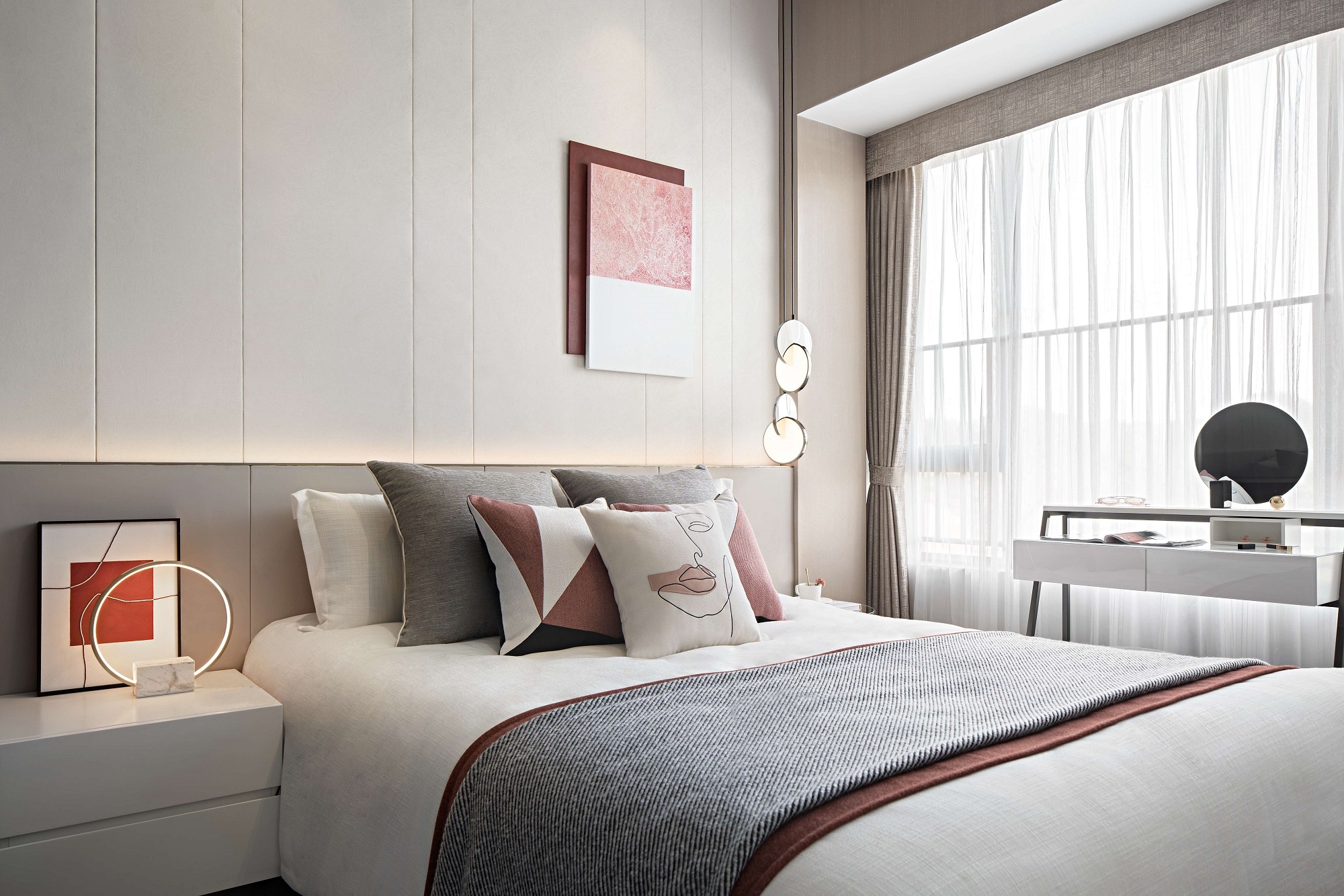 臥室靜謚有序,光影在彼此之間形成隱隱的虛實(shí)關(guān)系,大面積留白給人以無(wú)限遐想,簡(jiǎn)約的家居和現(xiàn)代感十足的燈具形體作為底襯,加以位置不居中的壁畫點(diǎn)綴,也點(diǎn)亮了原本平靜的空間。