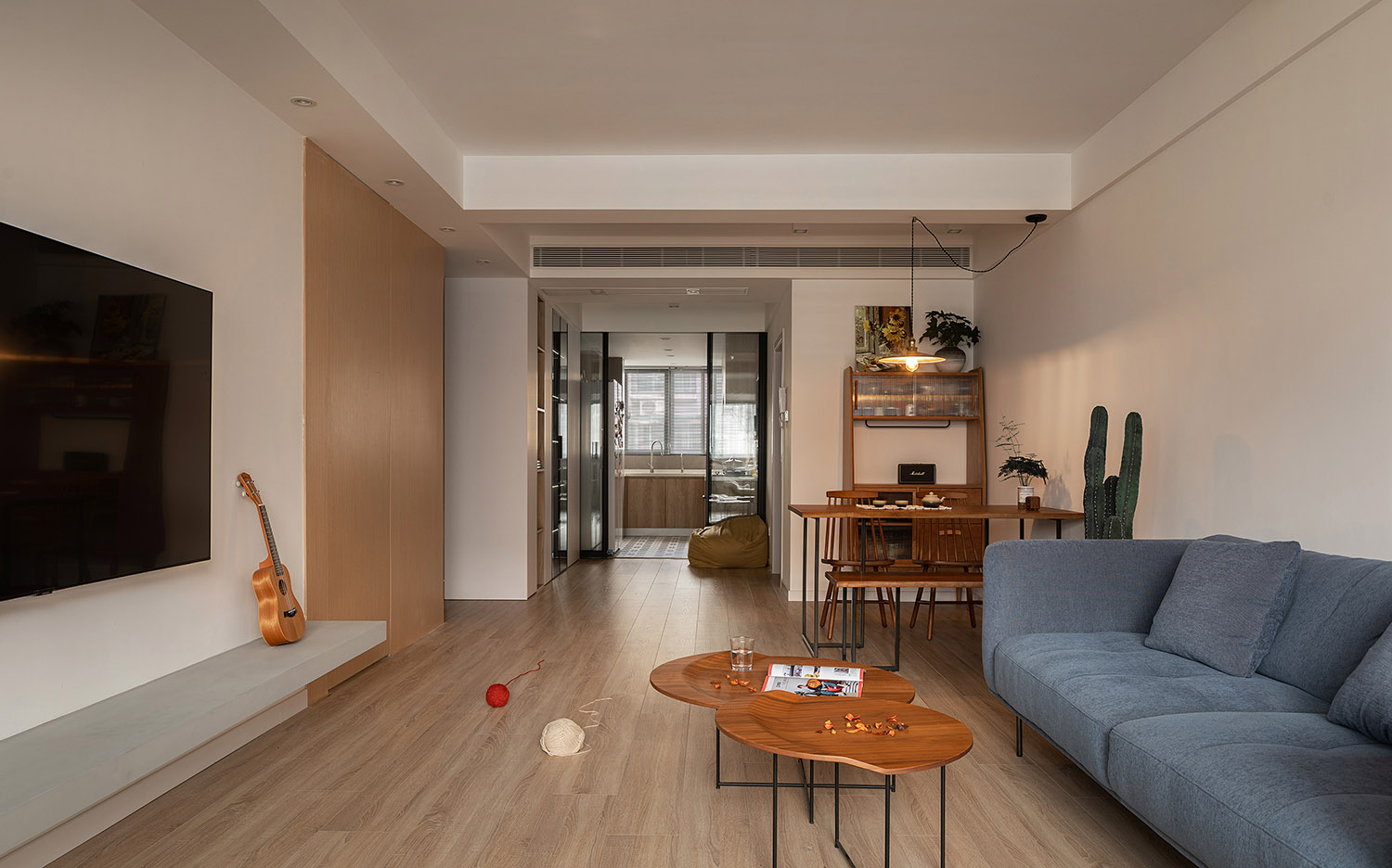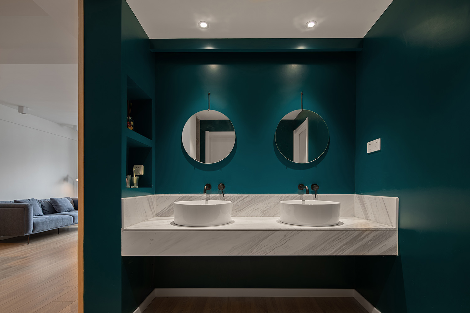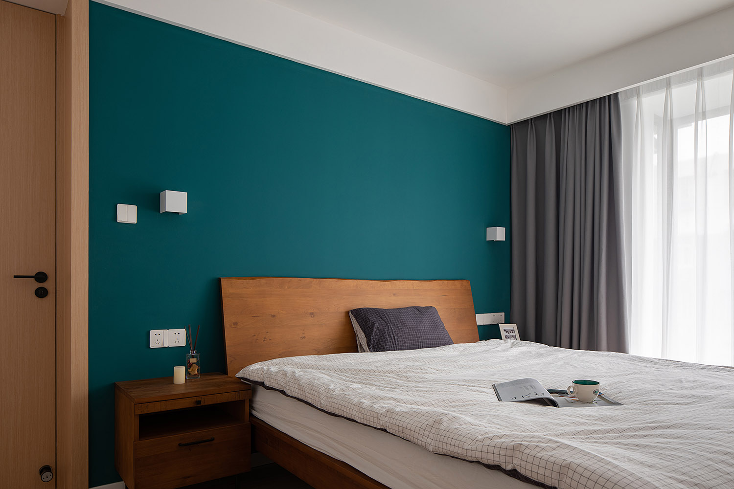 圍繞著寧靜舒適作為整個設計的中心思想,主臥采用了具有寧靜力量的孔雀藍為主色調搭配木材質,讓屋主休憩時,能體會到身體自在舒適以及彌漫在周圍的無聲的溫暖。