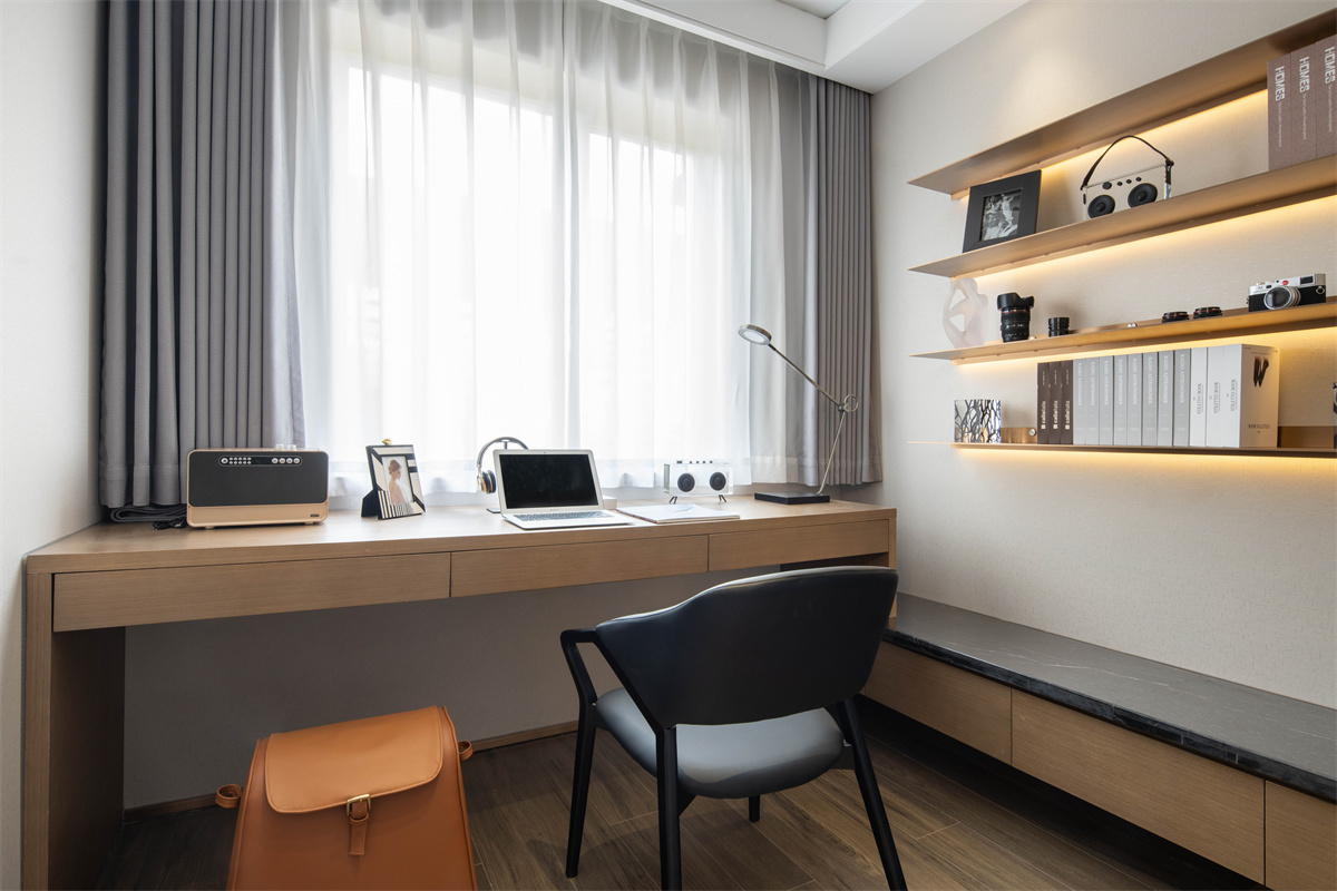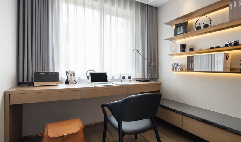 黑色皮椅所點綴的穩重感,與銀色臺燈所特有的摩登感,形成微妙的氛圍組合,在嚴謹與靜穆中,思索人生真諦。
