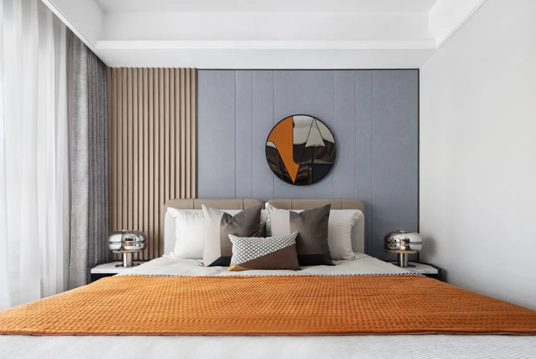主臥沉穩的色調搭配藝術畫的抽象氣質,將一種恰到好處的優雅散發開來。衣柜采用玻璃門,讓雅咖變得通透、輕盈,而不再是乏味地收納服飾,同時也是主人展現收藏飾品與生活品味的角落。窗臺加載休憩屬性,成就室內風景一隅,閑暇之時,屋主伴侶在這里享受美好時光。
