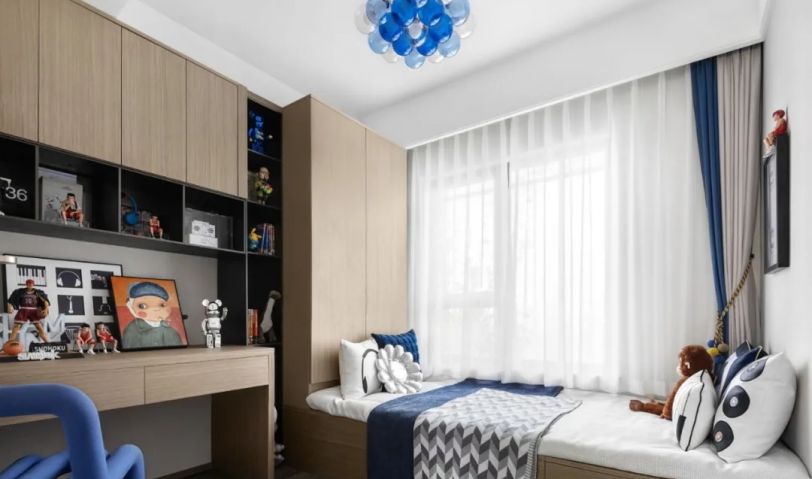 兒童房以明亮的藍色與暖橙相互碰撞,空間中融入收藏手辦的興趣愛好,放置玩具收納柜,為小主人留有足夠的玩耍收納空間。柜內各式玩具與書籍,前方櫻木花道公仔迎光而立,好似一個奮發向上的少年,身后承載著的是夢想,而夢想在閃閃發光。
