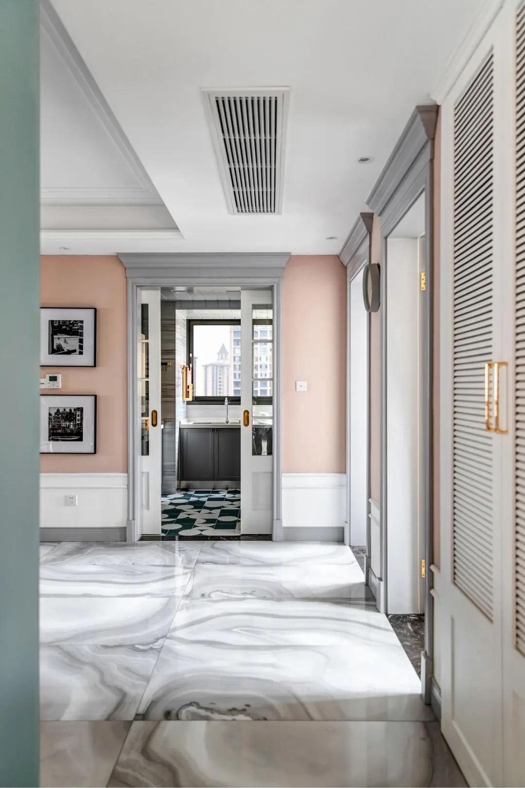 玄關進來,廚房門口兩側粉色的墻面,結合優雅造型的門套,帶來一種優雅檔次的第一畫面感。側邊的柜子以白色百葉門的設計、結合金色的拉手,也是顯得更加優雅精致。