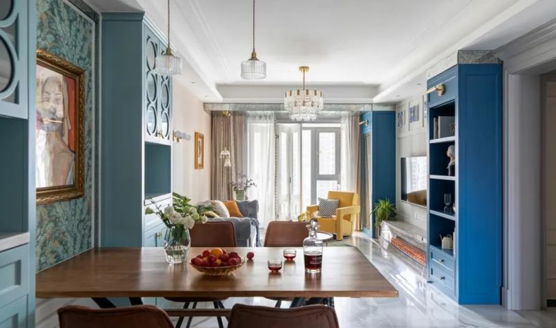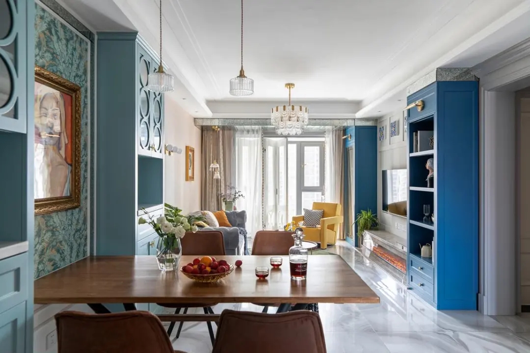 餐廳與客廳連貫,風格上也是采取混搭的設計,讓空間被各式各樣的藝術元素充斥。餐廳側邊的餐邊柜在中間留出了一個嵌入餐桌的位置,餐桌卡進去中間,兩側對稱的餐邊柜。中間一幅抽象派的人像裝飾畫,在獨特的藍色背景墻烘托下,帶來的空間感是藝術感滿滿。