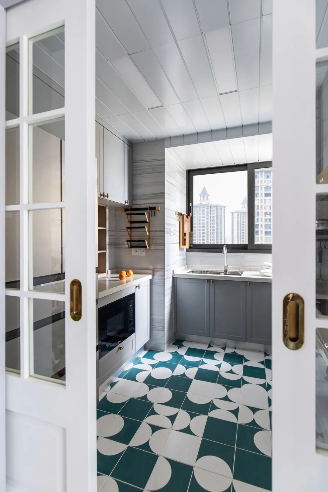 廚房地面是青白拼色的花磚,定制灰色櫥柜,在L字形的操作臺下,為主人帶來了一個明亮文藝的烹飪空間環境。