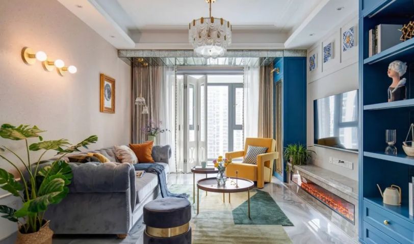 一眼看去,客廳有著諸多的設計元素,沙發墻是暗粉色的、沙發是歐式造型的灰色皮藝材質,而茶幾則是極簡的托盤設計,電視墻加入地中海風格的藍色,結合細節優雅、大膽配色的軟裝,也讓客廳充滿優雅時尚的高級設計氛圍。