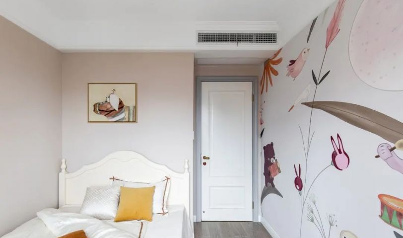 粉色調的兒童房空間,床鋪靠墻,中間留出寬敞的通道,另一側墻面貼上一整幅童趣滿滿的動植物圖案墻布,讓空間充滿浪漫活潑的可愛效果,兒童房角落布置一個畫架,布置一張粉色的小凳子,結合星點窗簾的呼應,讓空間顯得童趣感滿滿。