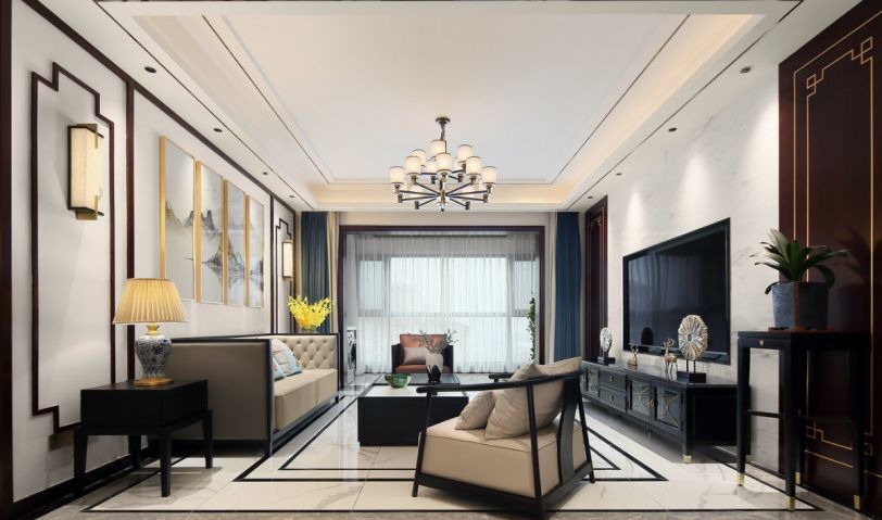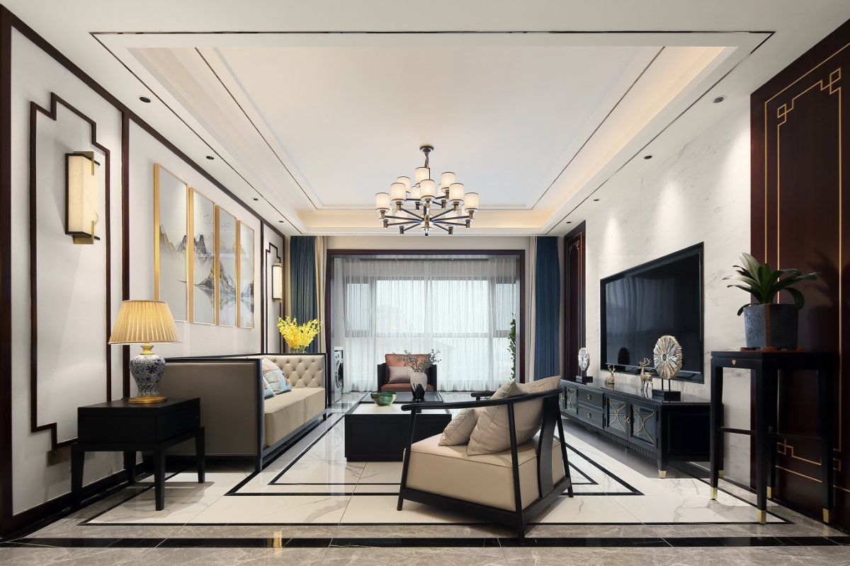 客廳以黑、白做底,輔以深色和米色,隨意潑灑、點染,映襯出空間的清雅寫意。子曰:“知者樂水,仁者樂山;知者動,仁者靜;知者樂,仁者壽。”石材、金屬、水墨巧妙兼容,舒緩的東方意境是主人特有的情懷。頂面新中式風格的吊燈,提亮了整個空間,同時與天花金屬線條遙相呼應。水墨般的大理石電視背景和內嵌的電視渾然一體,共同演繹了客廳區域的儒雅調性。沙發背景墻的木質線條以及山水掛畫,仿佛在訴說“山水從來不在遠方,此心歸處是吾家”。
