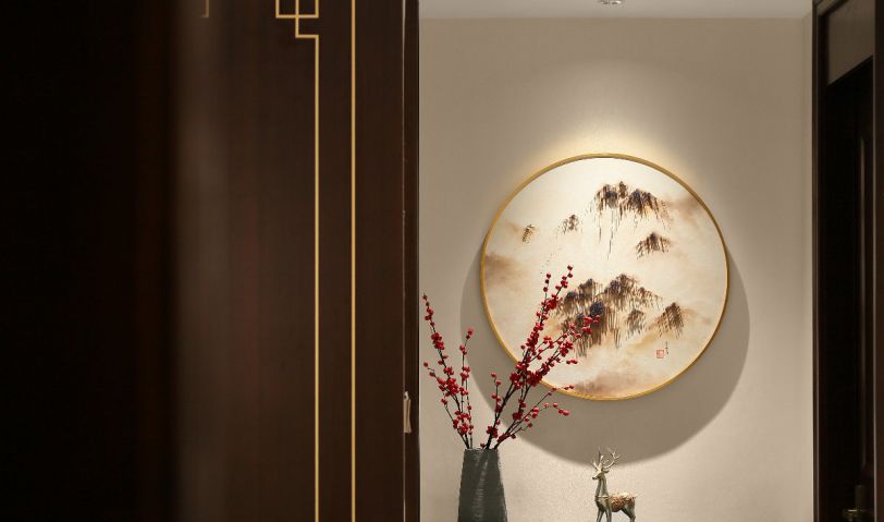 玄關端景柜上方的銅圓釘子畫,立體感強,變化中又有統一,成為進出吸睛的亮點。在交織的過道空間,用射燈的光來強化掛畫的質感,翰墨禪意輕輕點染,于細節之處泛起漣漪,呈現整體澹泊清靜、拙頓歸樸之意境。
