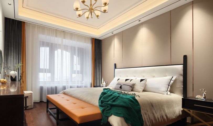 主臥,暖咖色、米白、灰色碰撞橙色的跳躍,沉淀心靈卻不失情調。“鳳髻金泥帶,龍紋玉掌梳。走來窗下笑相扶。愛道畫眉深淺、入時無。”北宋詩人·歐陽修《南歌子·鳳髻金泥帶》中描繪的丈夫為妻子畫眉的情景,仿佛就在眼前浮現。整體暖色燈光營造出一個溫柔的環境,米白色皮床配合咖色硬包以及豎向金屬線條,大氣又溫馨。