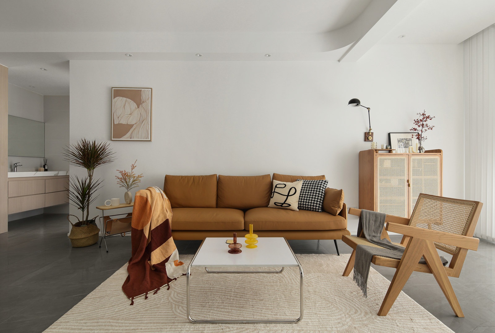 女主小姐姐喜歡溫和的顏色,我們在設計交流的時候,把色調定為木色白色為主,暖橙點綴,灰色打底,整體空間給人靜謐溫馨的感覺。燈光設計采用無主燈,用點光源壁燈等組合滿足客廳采光需要,頂部的弧形增強設計感,也令空間更柔和。沙發(fā)背景干凈簡約,木橙散發(fā)緩緩暖意。