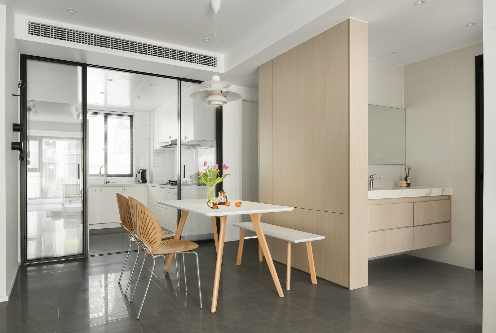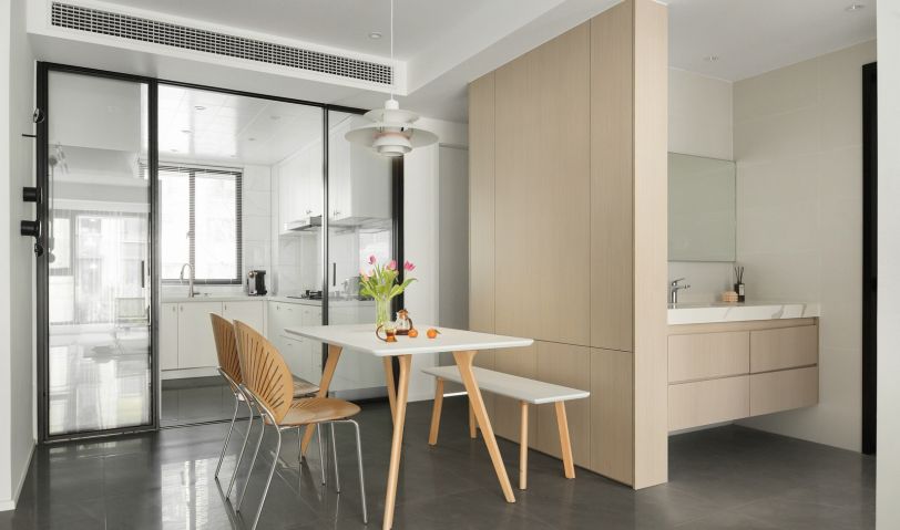 餐廳背景墻用木飾面裝飾,剛好與雙干區(qū)形成整體。廚房用玻璃移門劃分空間,讓空間通透。