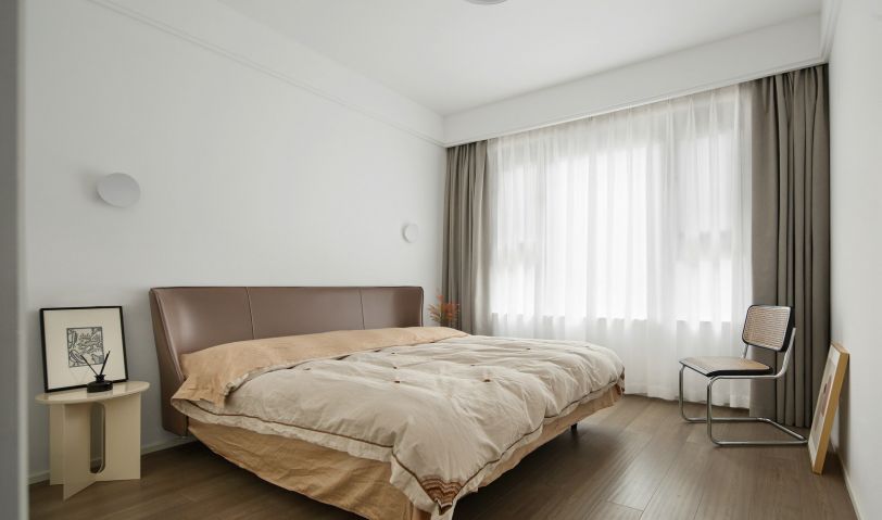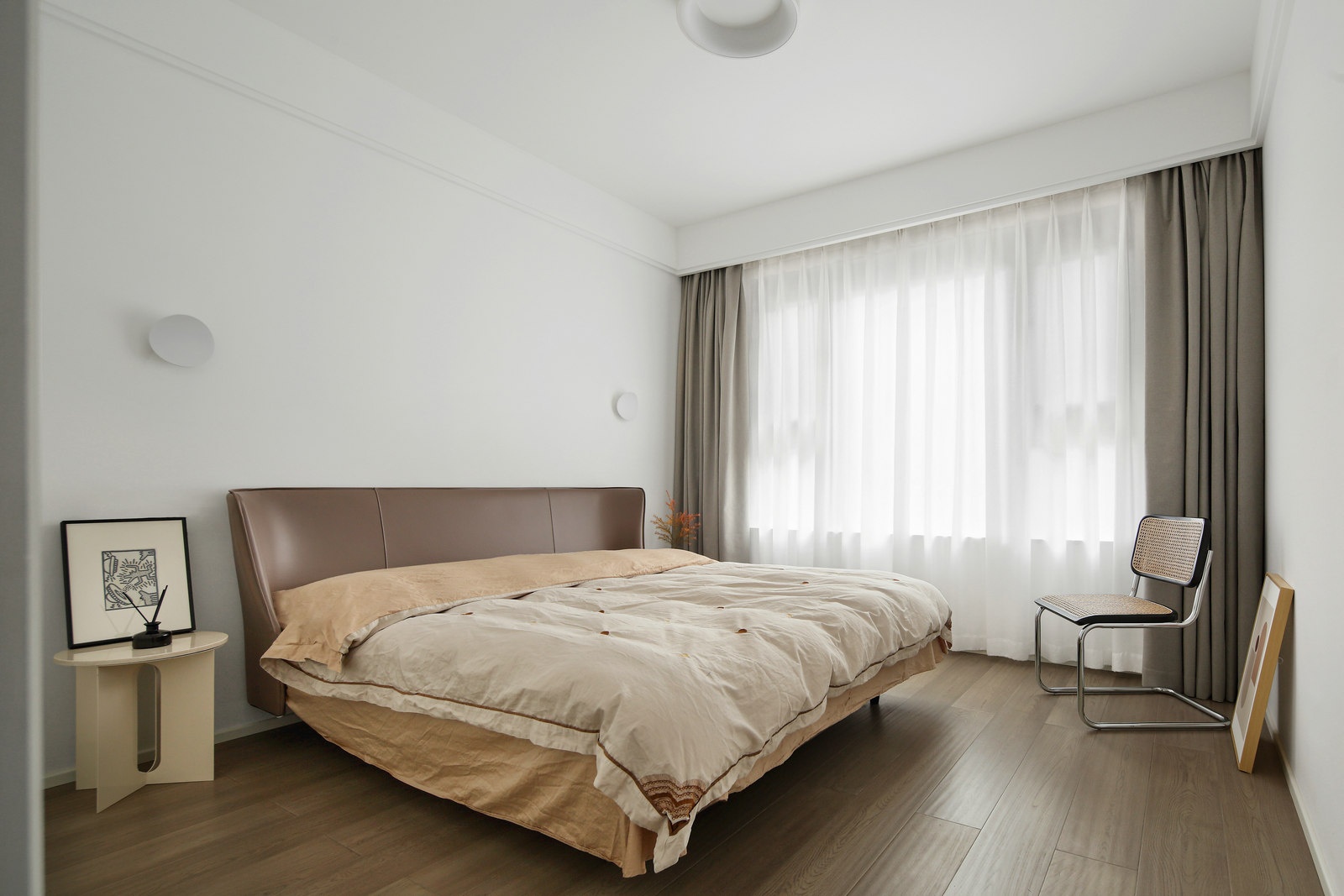 主臥的衛(wèi)生間外放后,這里變身一個純粹的休息空間,一對簡約壁燈,皮質床頭,臥室的材質和色彩的選擇都延續(xù)客廳的基調,整體美感由此而生。
