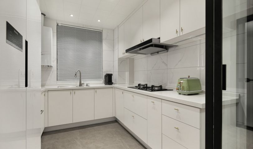 廚房U型櫥柜,乳白色干凈明亮,搭配精致的柜門小把手,細節(jié)見品質。
