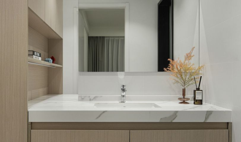 干區(qū)延續(xù)懸掛柜設計,方方面面考慮到實用和美觀。大理石臺面和木飾面形成材質對比,一剛一柔間提升氣質。