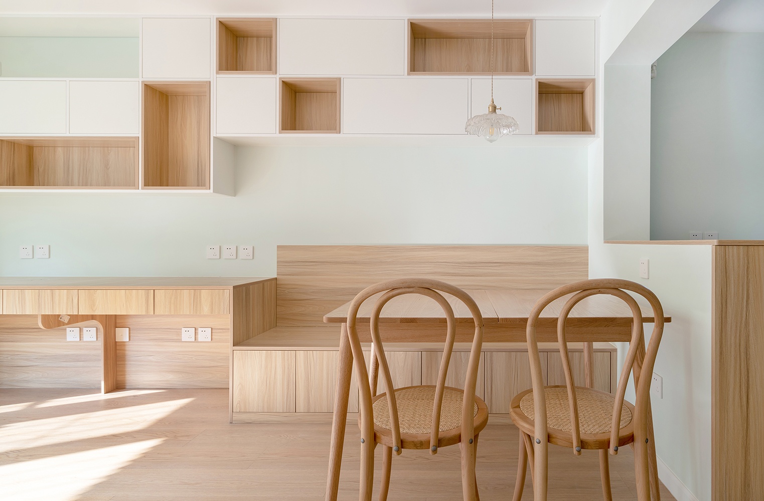 餐廳一側選擇了卡座的形式,下邊結合儲物來做。餐桌選擇了可以抽拉的餐桌,平時1200mm,親戚朋友來了,多人就餐可以切換成1400mm。