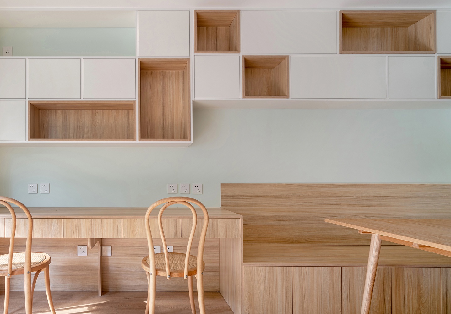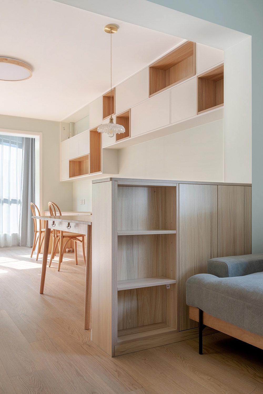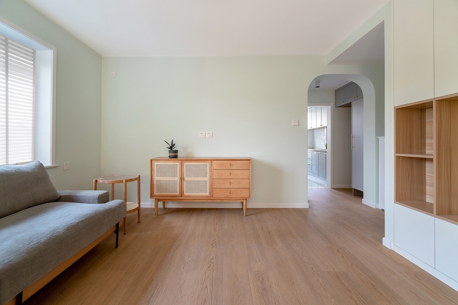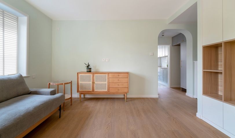 客廳沒有過多的裝飾,木地板搭配墻面的馬卡龍色,清新自然。沙發旁邊的柜體里邊是暖氣分水閥,留了敞開的格子供沙發這邊使用。淺灰色的沙發不僅有顏值,坐感也很舒適。柜體細節圖,原木色的板材和淺灰色布藝的沙發兩種材質的綜合。配比恰如其分,毫無違和感。客廳區域有一個朝西的窗戶,下午西曬比較嚴重,配了不占空間且能過濾陽光的百葉簾。白色的百葉簾與埡口顏色統一,門洞圓弧的處理,讓整個空間變得更加溫和、流暢。電視柜結合儲物空間來做,全白色未免有些單調乏味,加入原木色套格,豐富立面效果的同時,避免視覺疲勞。