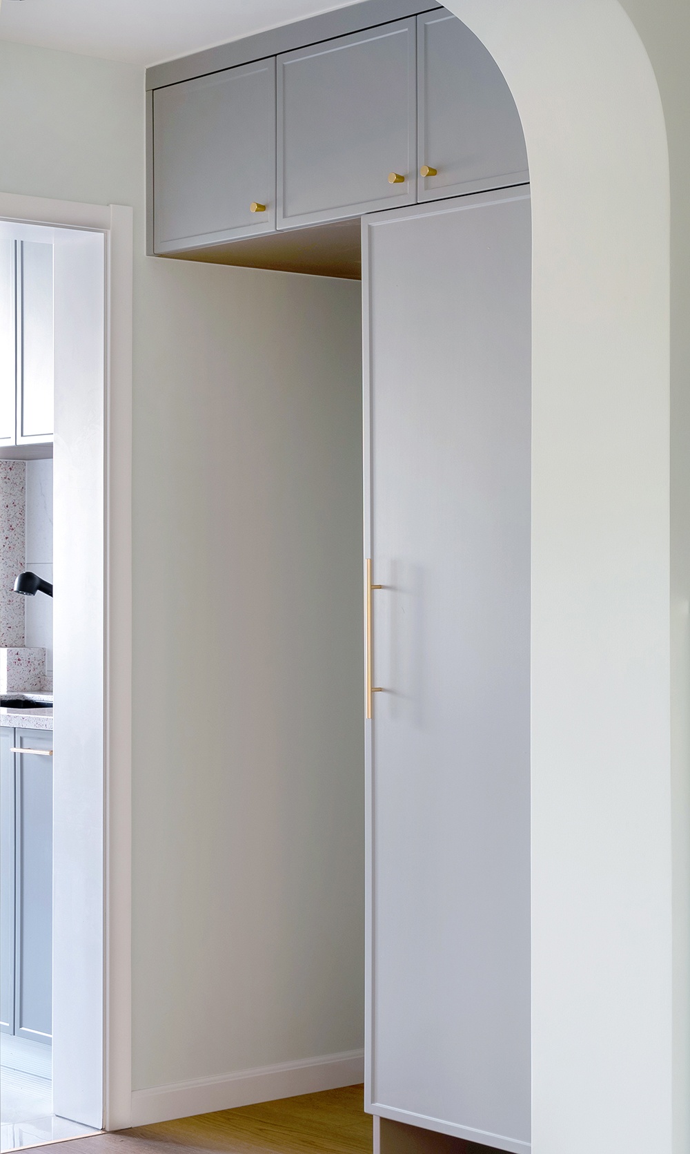 玄關灰藍色的掛衣空間搭配黃銅拉手更顯精致,冰箱外置,內嵌一側。