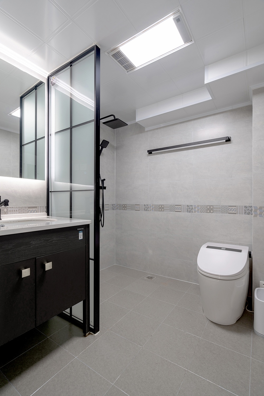 淋浴區預留了足夠的空間,供媽媽給兩個孩子洗澡的操作空間。花灑玻璃隔斷和毛巾架都統一用色。