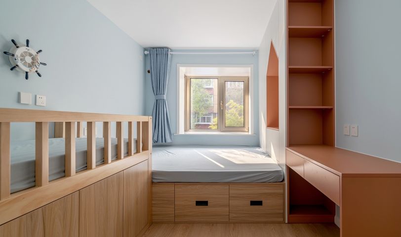 朝南的兒童房,定制了超大的榻榻米睡眠區,旁邊加了獨立的單人床,輕松的容納下一家四口的睡眠空間。墻面的輪舵造型壁燈充滿了童趣,窗簾選擇了跟墻面一個色系的藍色。兒童房書桌還有敞開格做了橙色,飽和度相對高一些,跟墻面做一個強烈的對比,激活空間。因為是兒童房,兩個孩子都還小,舍棄一部分儲物空間,做了小房子造型的龕,盡量的增加一些童趣的元素進去。