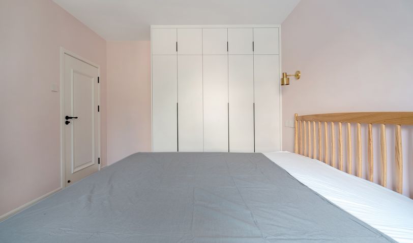 次臥是父母的房間,做了通高的大衣柜來保證充分的儲物空間。應屋主要求,墻面刷了女主喜歡的淺粉色。黃銅材質的壁燈質感還是很強的,床和梳妝臺都是購買成品。