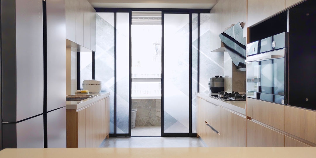 廚房是雙一字布局,開敞的空間就算有兩個人同時操作也不會擁擠。設計師用了鋁鎂合金推拉門分開洗衣區和廚房,靈活透光。灶臺附近臺面都在吊柜下方單獨配置操作照明。墻面是新中源的瓷磚,這個紋理做完業主很喜歡。水槽上方也單獨配置了操作照明,水龍頭使用的是米家感應式龍頭。不用擔心手上的油漬吧龍頭弄臟啦。