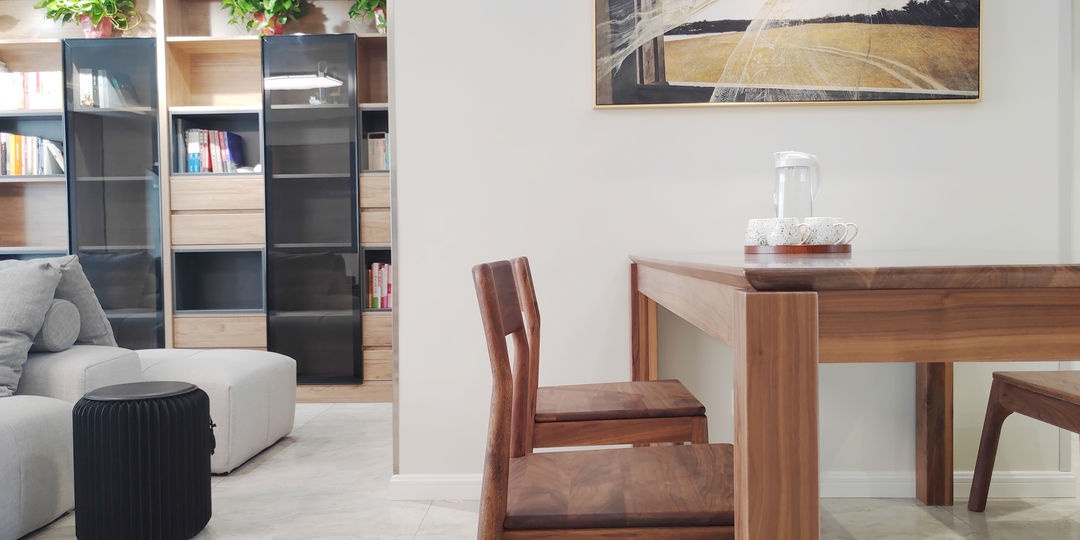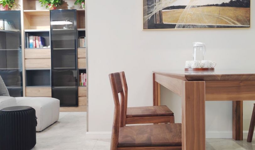 沙發旁是1.8m的胡桃木餐桌,家里平時來兩三位客人也是完全夠用。