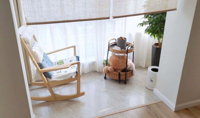 客廳陽臺用KD板做了一個超大飄窗,男主人喜歡在這里休閑喝茶。小孩子也可以走在這玩積木,非常使用貼心。飄窗和客廳形成圍合的空間,逢年過節再也不用擔心朋友太多沙發坐不下。飄窗尺寸較大,睡人都是沒有問題的??蛷d視聽使用的是激光投影設備和抗光幕布,由于激光投影,需要離墻有一段距離,又想使電視柜靠墻,所以用了和激光投影聯動的伸縮臺。