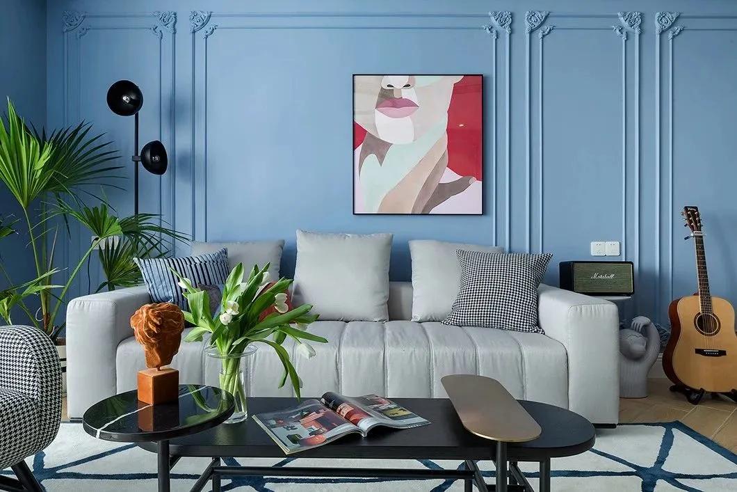 客廳整體現代舒適的空間,陽臺與客廳打通做成抬高的地臺,裝上紗簾讓自然采光進入客廳,而客廳整體在藍色的墻面基礎,布置深色電視柜與茶幾,在綠植與優雅家具的搭配下,也讓空間顯得格外的安靜高檔而優雅。沙發墻在藍色的背景墻基礎,加入邊框造型,并掛一幅紅色的裝飾畫,增添了空間的時尚氣質。灰色布藝沙發+黑色橢圓茶幾組合,沙發邊上的盆栽與吉他,也使得空間更加有精致感。