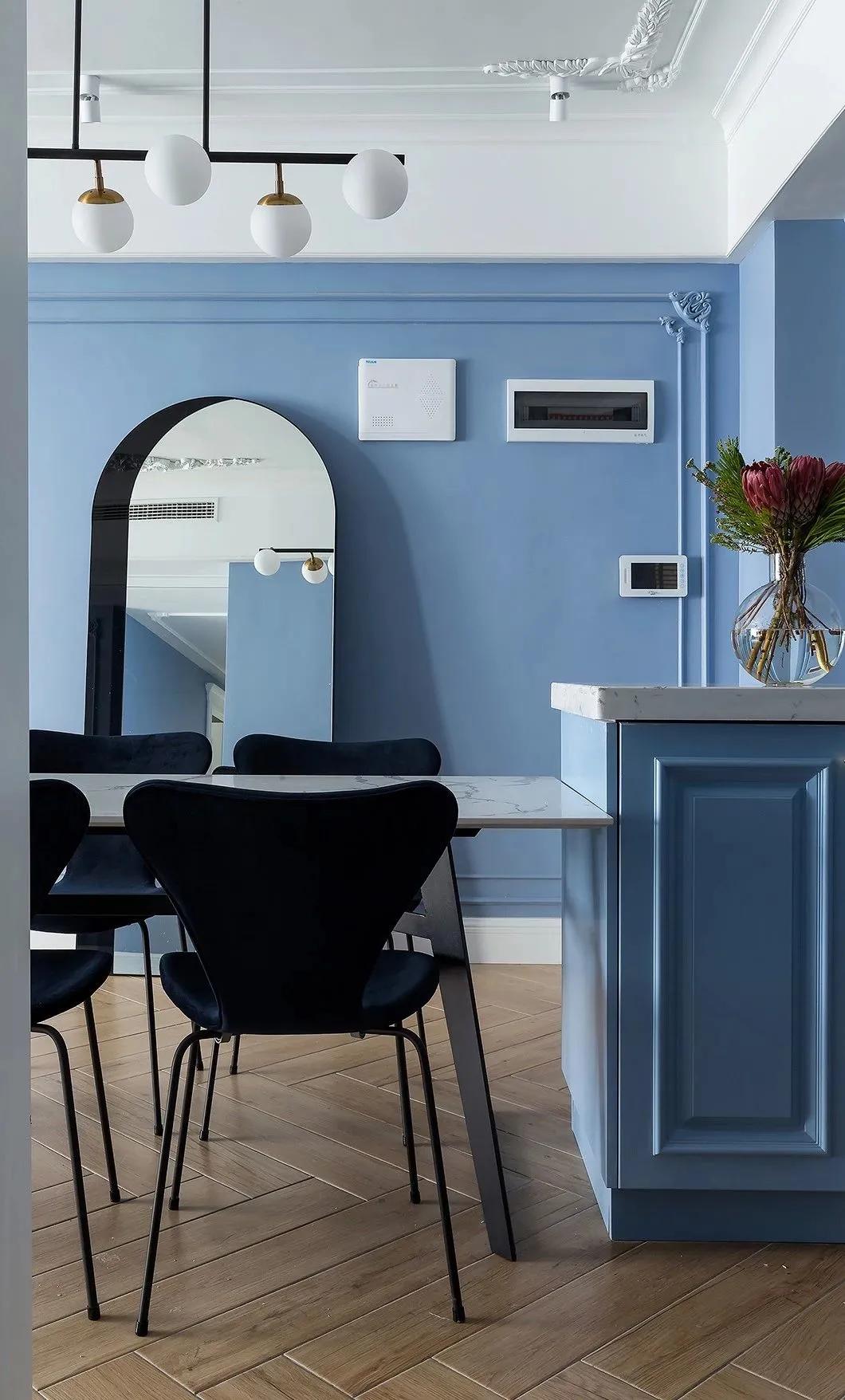 餐廳保持藍色調的空間,在靠近門口的過道靠放一面拱形造型的全身鏡,為主人出門提供了一個整理儀容的體驗;餐桌則是挨著中島臺布置,以石材臺面的設計,搭配上深色的餐椅,臺面上還有花瓶的布置裝飾,也讓空間顯得更加優雅浪漫而情趣。