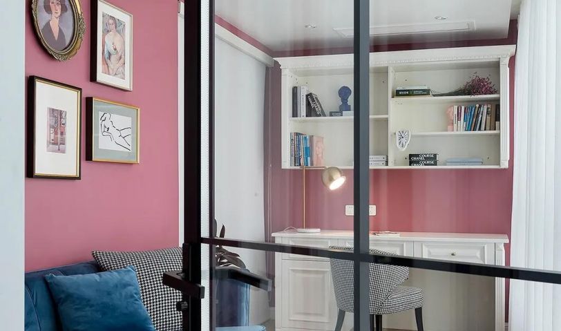 書房以玻璃門的設計,讓空間保持安靜私密,又讓采光在空間內得以互動連通,粉色墻面與藍色休閑沙發、地毯,墻面上掛上一組復古范的裝飾畫,讓整個空間顯得更加。書桌在粉色墻面基礎,裝上擺設書柜與書架,粉色與白色的擺飾品,結合書籍的裝飾,擺一張金色的臺燈,也讓空間顯得更加優雅華麗而高級,擺一張格紋座椅也是呈現出一種現代優雅的工作氛圍。