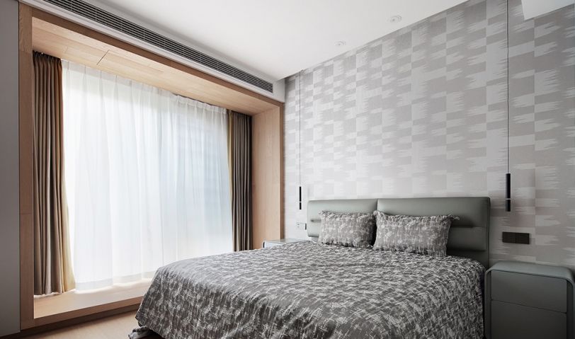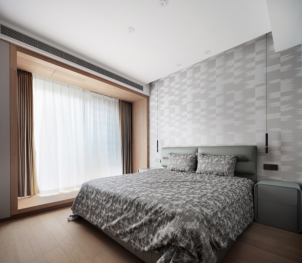 進門便能看到一個開放式的衣帽間,由梳妝臺、兩面衣柜圍合而成。浴室門選用長虹玻璃,透光的同時保證私密性。進門左手邊是睡眠區,落地窗以地板地臺的形式增加休閑空間,地臺的錯落感使起居室有了更多生活氣息。