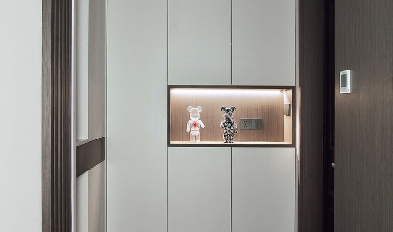 玄關入戶處以純凈的白為主,入眼是一片明凈純粹。懸空設計的柜體豐富空間層次,敞開的柜子頂部暗藏燈帶,讓人感受歸家的儀式感。
