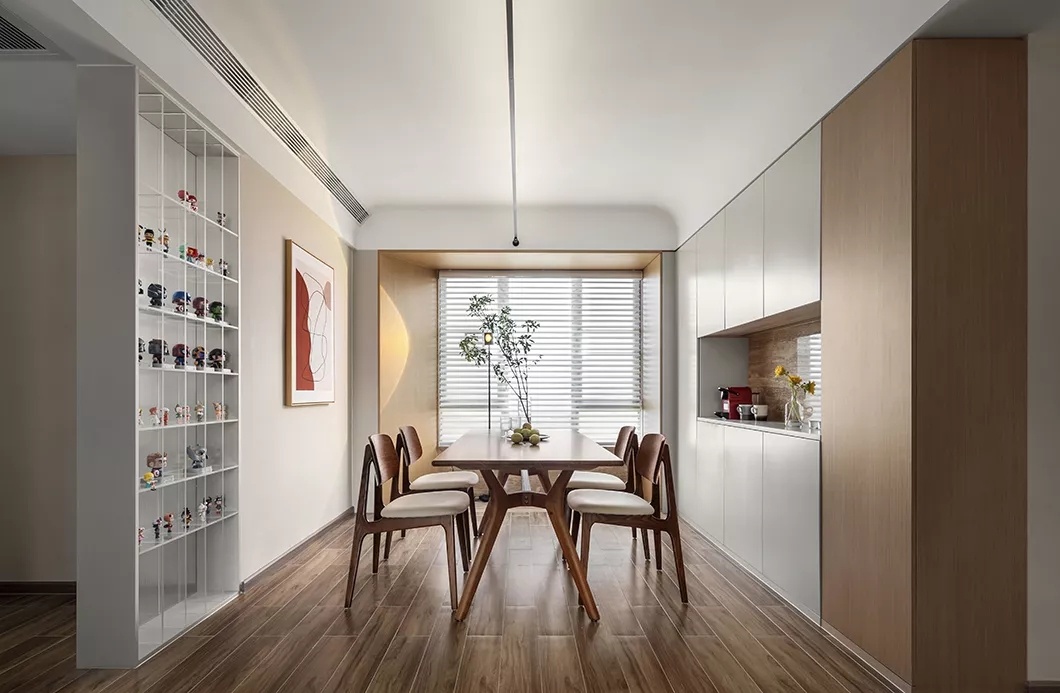 餐廳墻面與柜體延續白色基調,搭配胡桃木餐桌,簡約卻不乏質感。
