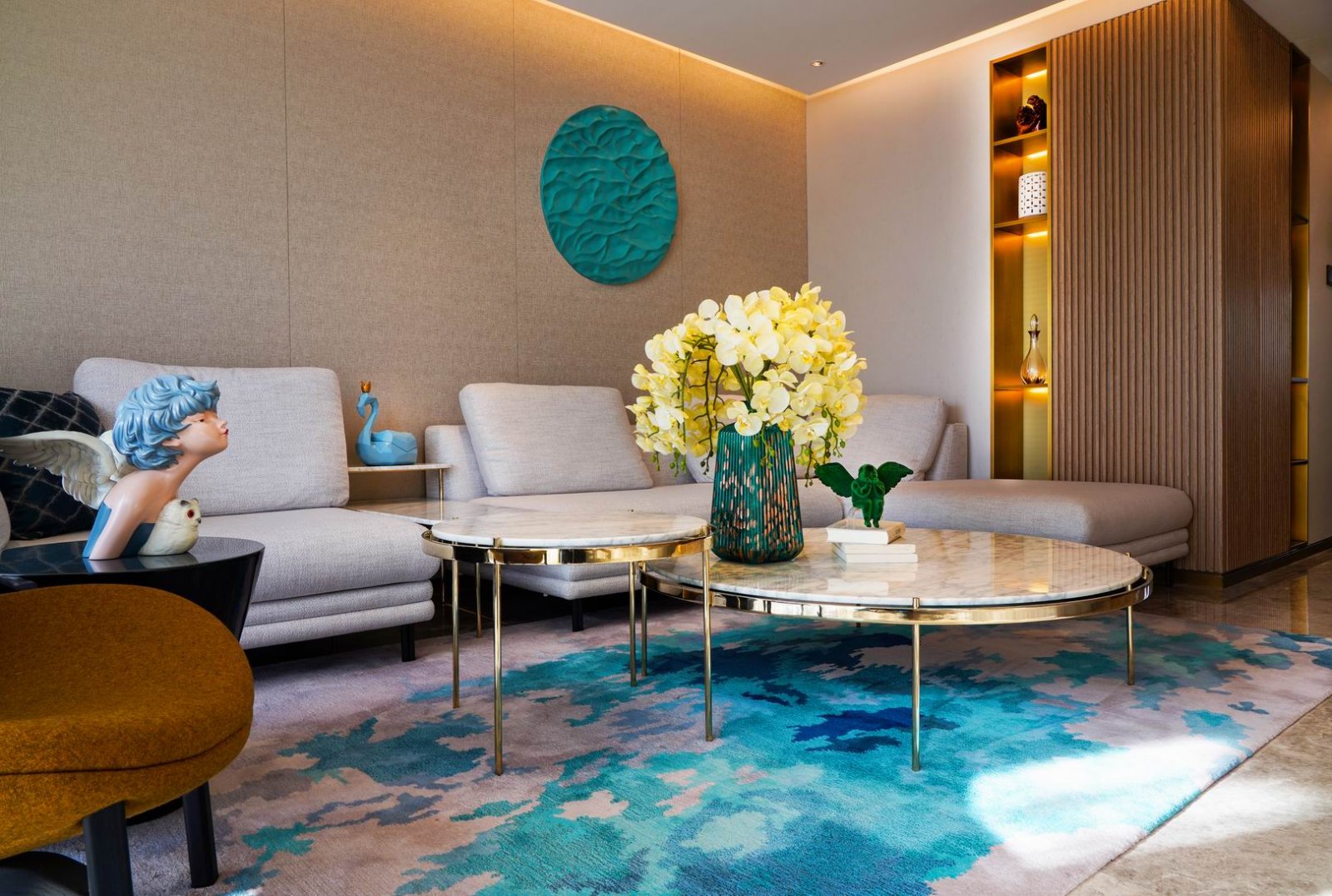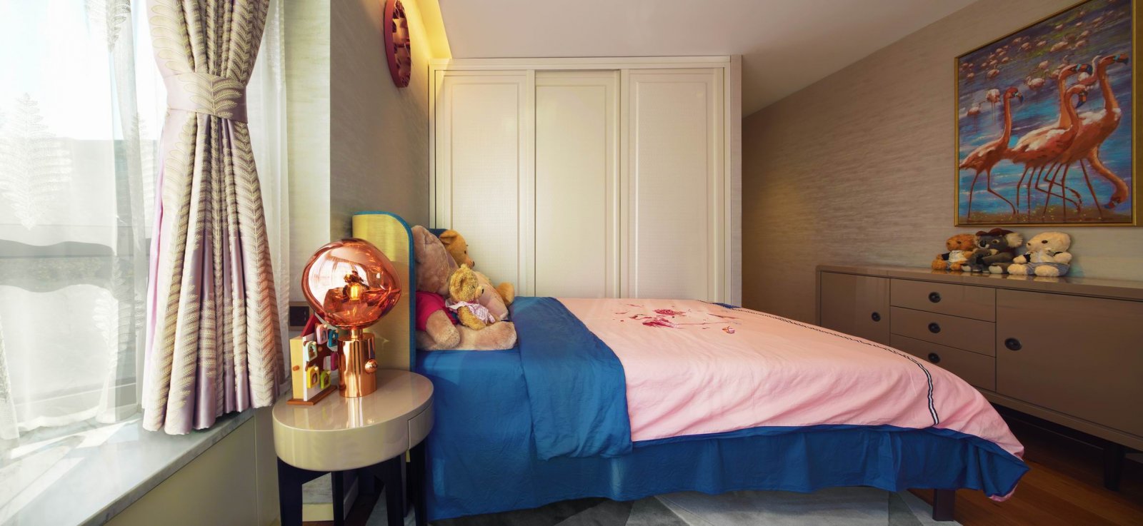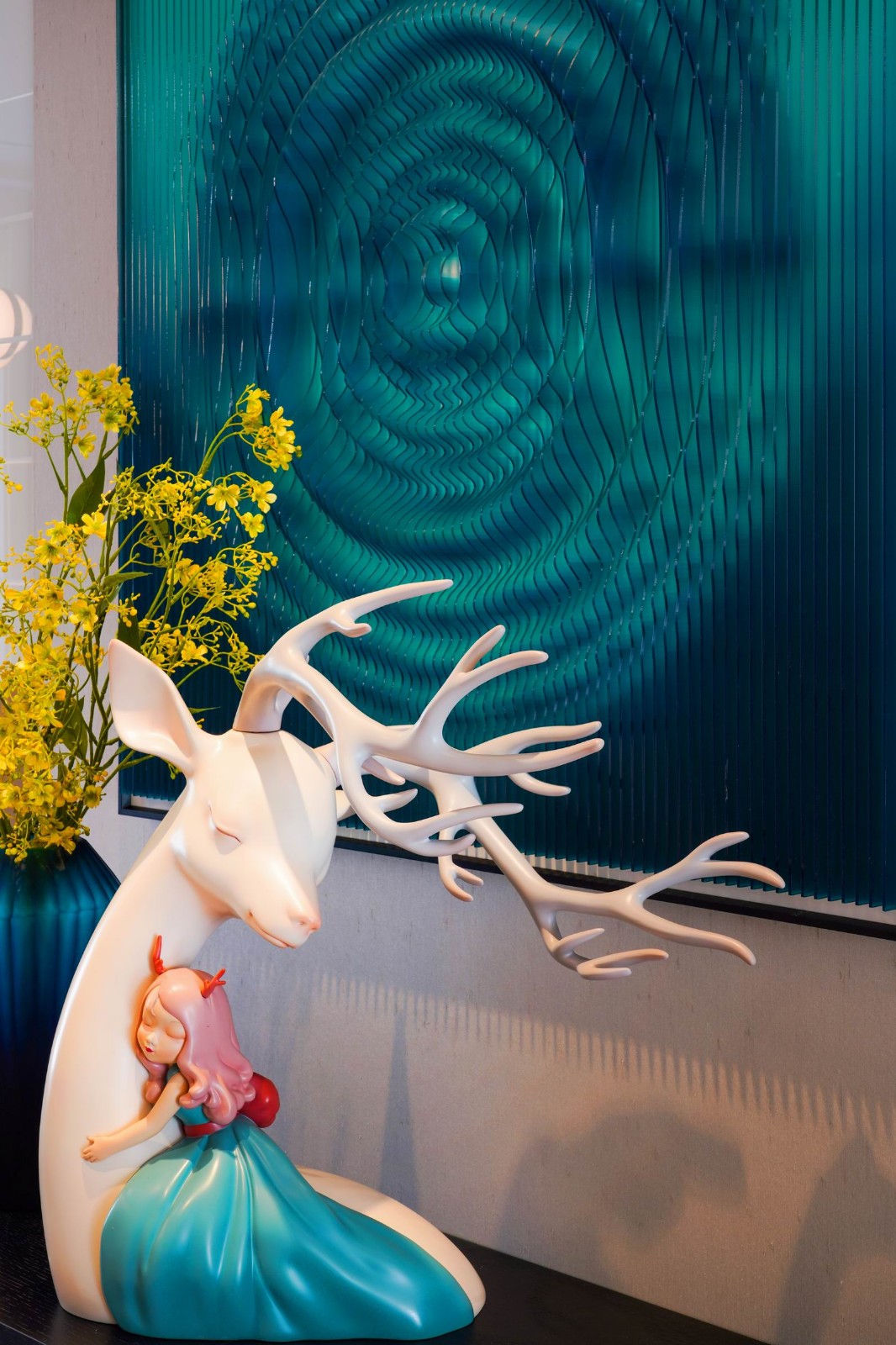 此外,玄關的水波紋立體畫、客廳墻面水紋木雕、各種動物擺件飾品、火烈鳥的裝飾畫等等,都在迎合人與自然的融和這一主題