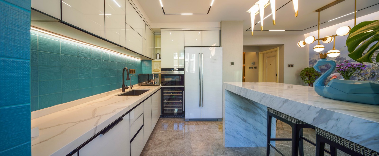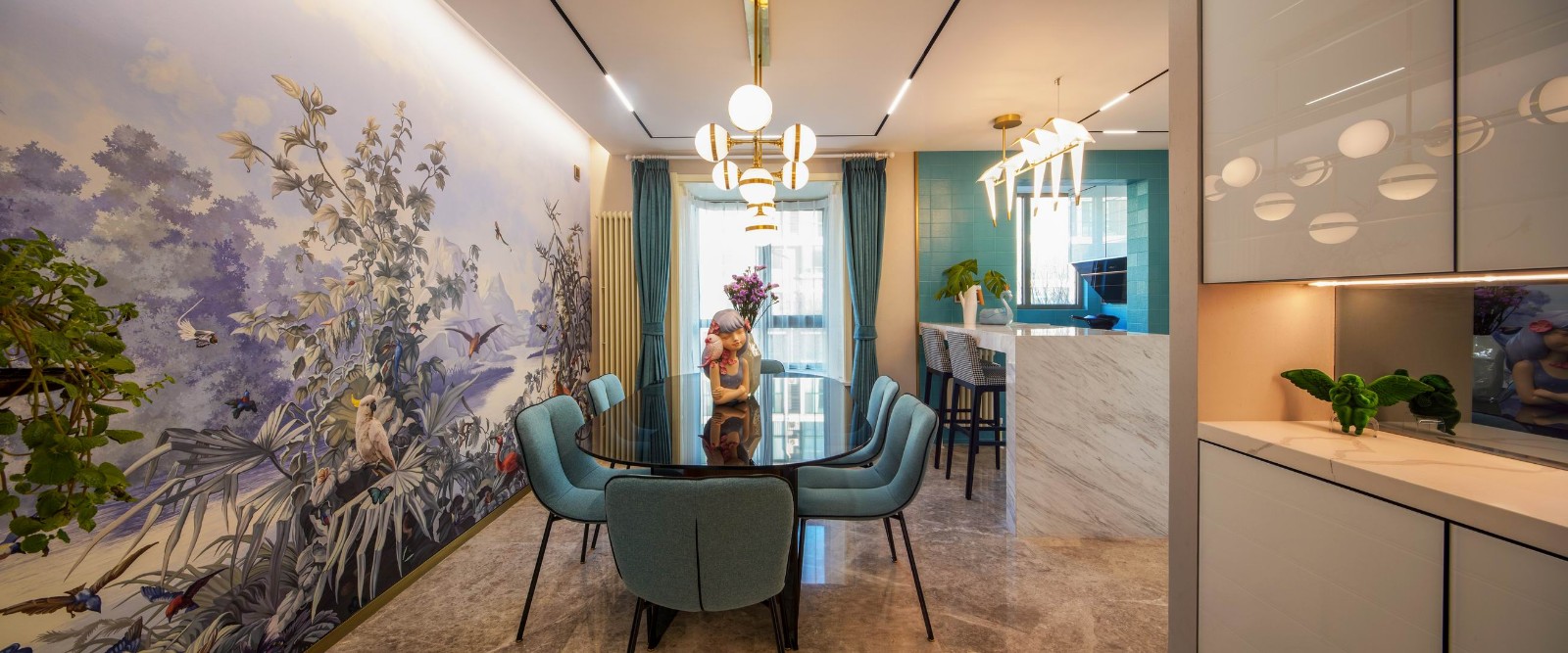 白色玻璃櫥柜配搭綠色肌理瓷磚的組合,是廚房空間顯得清新整潔,凸顯精致的生活品質。白鳥吊燈與餐廳叢林壁畫相呼應在一個環境里面。室內外光源的結合渲染空間豐富層次。
