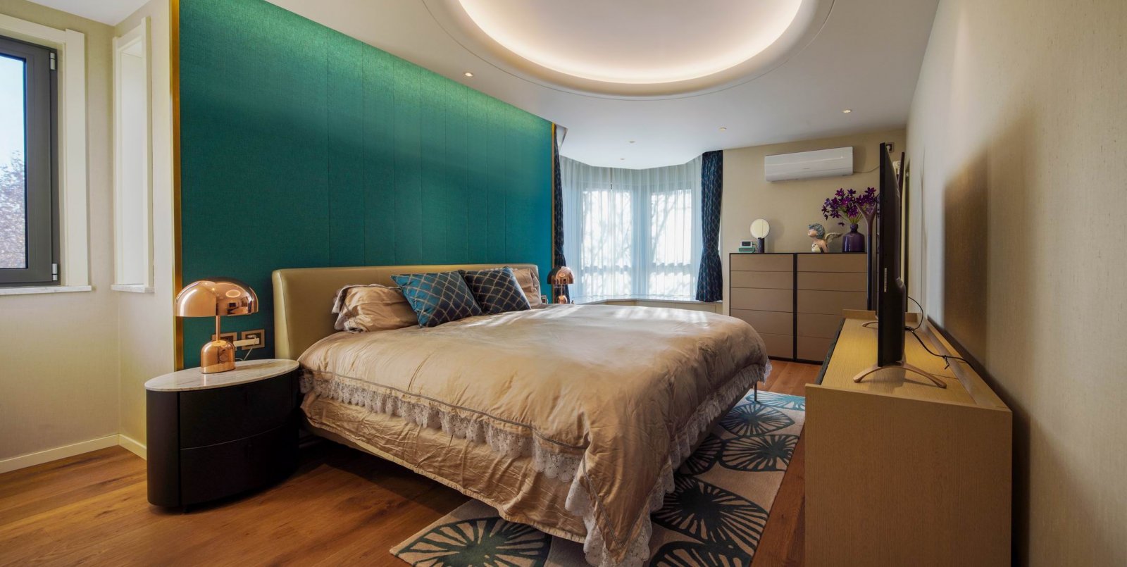 造型簡潔大方,綠色硬包布、手工植物圖案地毯以及家具配色都在統一迎合自然這一主題。