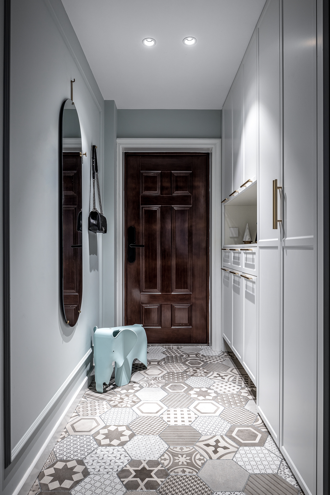 利用玄關(guān)的厚度打造了一排鞋柜,超強(qiáng)的收納空間完美應(yīng)對三人居住的置鞋難題。明亮的燈光打在左邊的穿衣鏡上,讓精致的女屋主每天都可以漂亮的出門,美麗的回家。